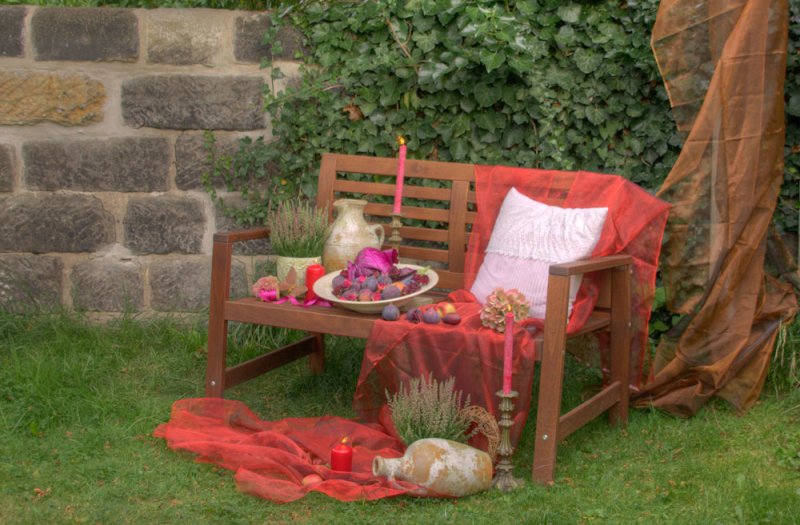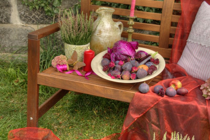Herbstdekorationen müssen sich nicht nur auf Sonnenblumen, Kastanien, Äpfel, Fliegenpilze und Igel beschränken. Ziehe dieses Jahr deiner Herbstdeko mal die Galarobe in den königlichen Rottönen an. Meine Herbstdeko reicht vom pudrigem Rosa der Hortensienblüten, über das tiefe Rubinrot der Kerzen und Rosen bis hin zum satten Violett von Feigen und Auberginen. Diese Dekoration für deine Terasse, deinen Wintergarten oder den Hauseingang wirkt opulent und wird sich garantiert vom üblichen unterscheiden.