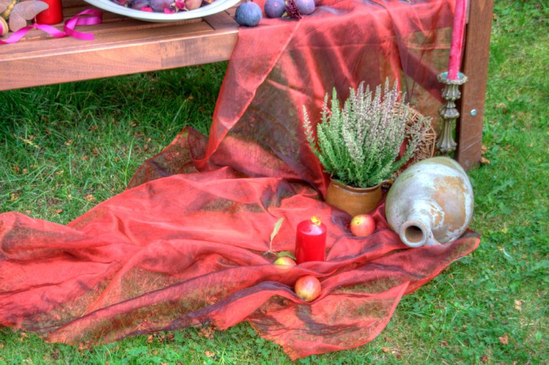 Die Farbpallete reicht vom sattem Gelbgrün, über Safran, zu Orange, tiefem Rot, bis hin zu dunklem Violett. Die Natur macht es uns vor und zeigt sich uns in den schönsten Farben. Wie prächtig wirkt doch eine Hagebuttenhecke vor einer blühenden Wiese mit Heide.