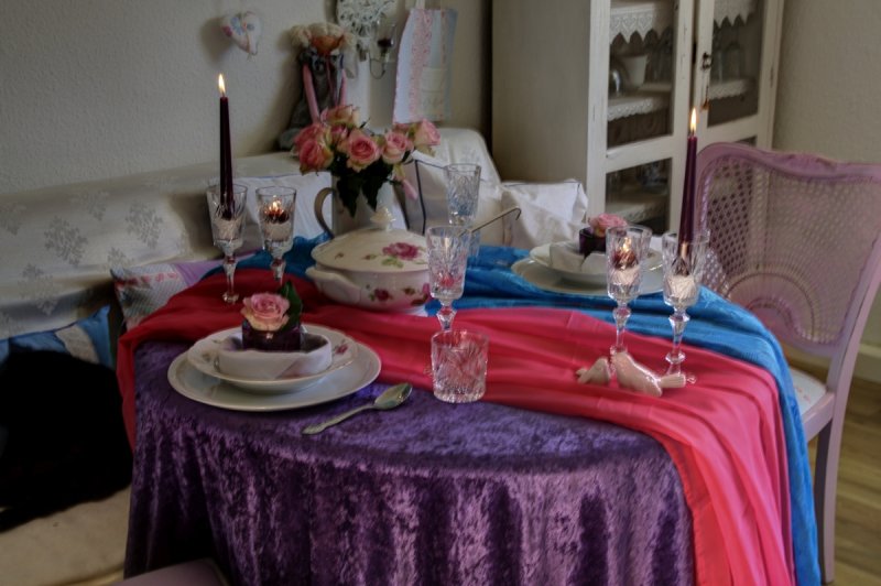 Suche nun passende Accessoires aus deinem Geschirrschrank aus. Bei mir wurde ein nostalgisches Rosengeschirr mit Kristallgläsern und einfachen, violetten Teelichtgläsern, zu dem violetten Samt und den Pink - und Türkisfarbenen Gardinen kombiniert. Wenn Du keine passenden, farbigen Kerzen hast, weiße gehen immer.
