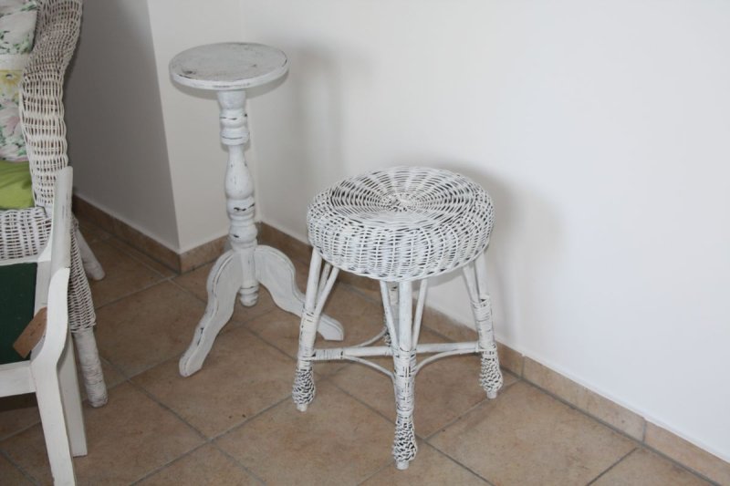 Echt Shabby Chic kommen diese Blumensäule (verkauft) und der alte Korbhocker daher. Auf beiden könnte statt Pflanze auch ein schönes großes Windlichtglas stehen.