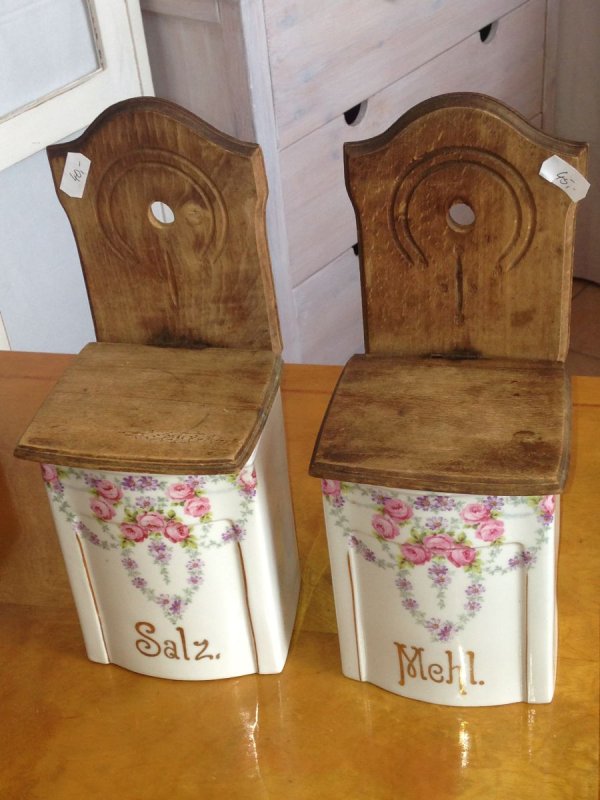 Die antiken Porzellanbehälter für Salz und Mehl machen jede Landhausküche komplett und am kleinen Beistelltisch im Shabby Chic Style kannst du stilvoll deinen Wein oder Tee genießen.