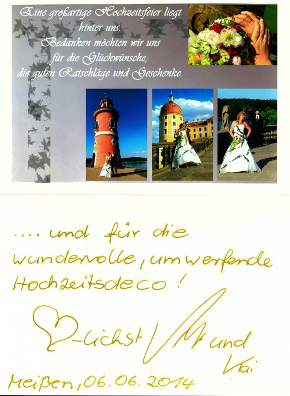 Weiter sagte sie: „Aber ihr müsst um 13.00 Uhr mit zur Trauung auf dem Standesamt in Meißen sein und feiern werden wir dann in Moritzburg.“