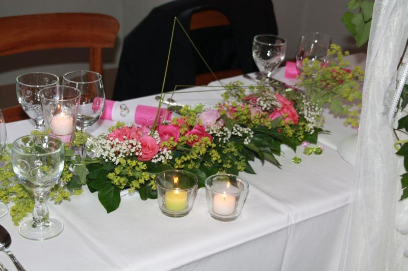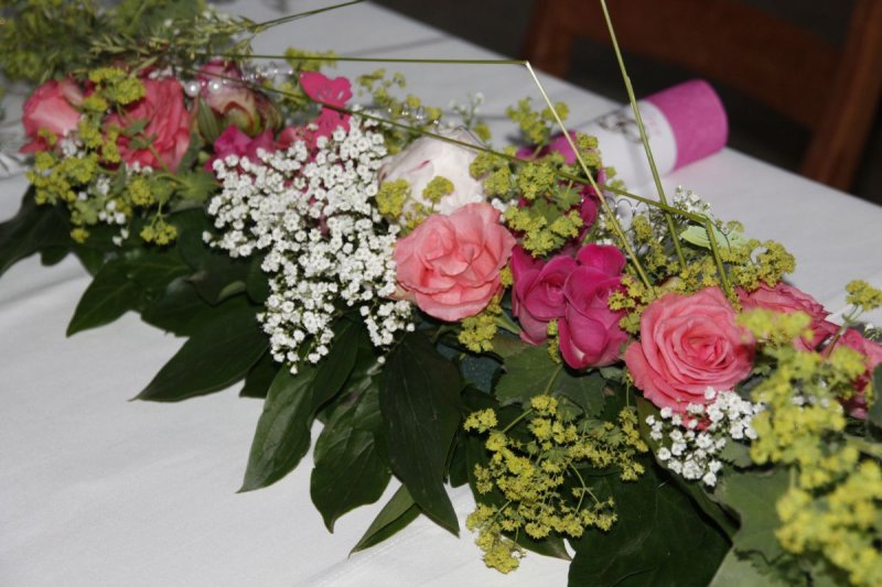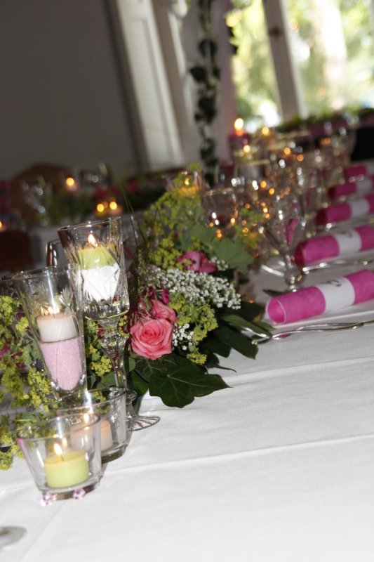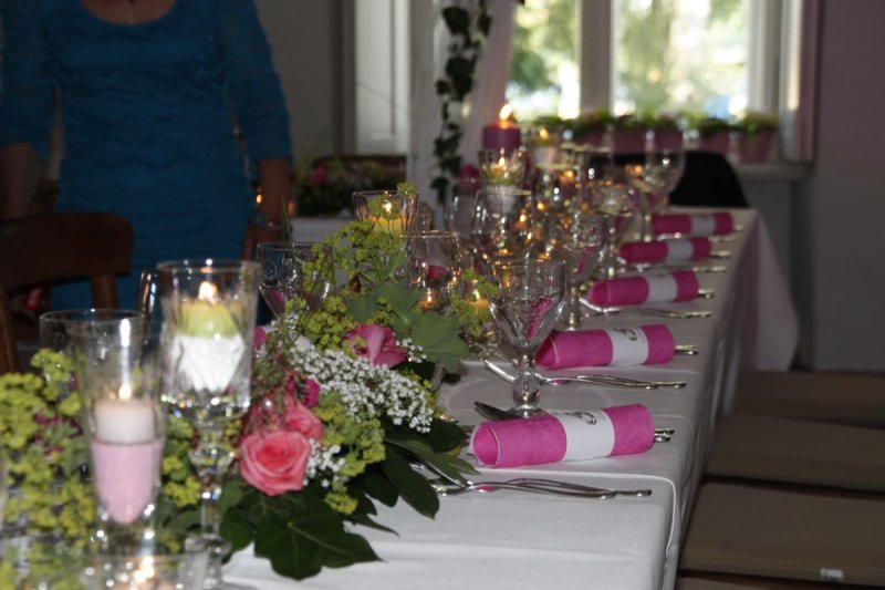 Die Trauung in Meißen, die Feier im Marcolinihaus in Moritzburg, das war fast Hexerei. „Ich möchte ein Meer von Blumen. Rosen, Pfingstrosen in allen Pinkfarben und gaaaanz viel zarten Frauenmantel.“ So die Worte der Braut, als sie die Dekoration bei mir bestellte.