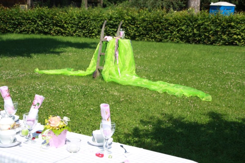 Wärend die Hochzeitsgäste noch das Brautpaar vor dem Rathaus fotografierten, waren wir bereits wieder mit dem Auto nach Moritzburg unterwegs. Das Kaffeetrinken und der Sektempfang sollten 15.00 Uhr im Freien stattfinden. Innerhalb einer Stunde hatten wir auch diese Dekoration, dank guter Vorbereitung gezaubert, so dass wir kurz vor dem Eintreffen des Brautpaares noch entspannt durchatmen konnten.