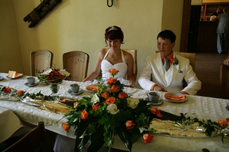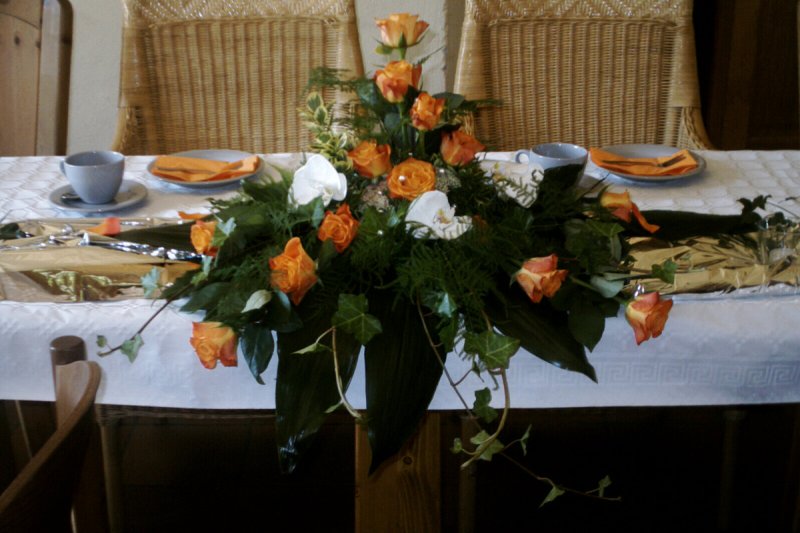 Auf den Fotos könnt ihr sehen, wie glücklich Pia und Uwe ihre Deko genießen. Die Blumengestecke für die Tafel fertigte damals eine Floristin an.